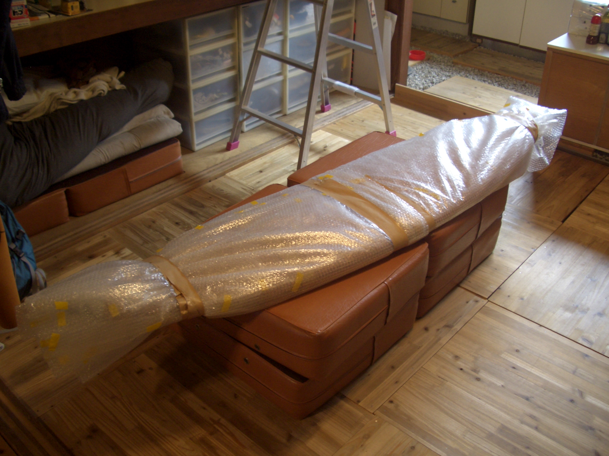 次に、ノーズとテールを覆うエアーパッキンを特に分厚めにぐるぐると巻きて、全体のエアーパッキンがとれないようにテープなどで止めてハードカバーを用意します。サーフボードによってはフィンが取れる板もありますが、取らなくてもきちんとぐるぐると巻いておきさえすれば全く問題ないですよ。